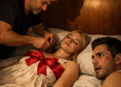 Standing beside the bed, visibly startled beneath the harsh light, was Natalie’s father, George Whitman, his aging frame trembling slightly while his weathered hands clutched a steaming red flannel cloth. His expression carried neither guilt nor fear, but instead radiated weary sadness, the profound exhaustion of a man burdened by silent responsibility.